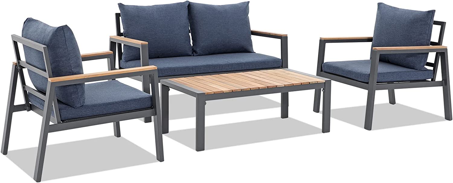 JOIVI Aluminum Patio Furniture Set, 4 Pieces Outdoor Conversation Set with Teak Wood Top Coffee Table, Sectional Sofa Set with Wood Armrest and Cushions for Outside Poolside, Lawn, Backyard, Gray