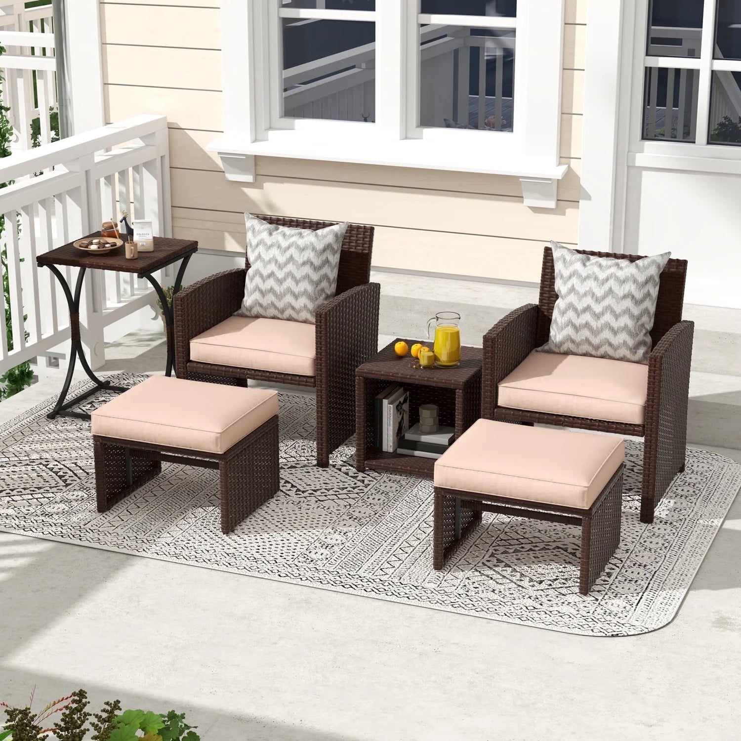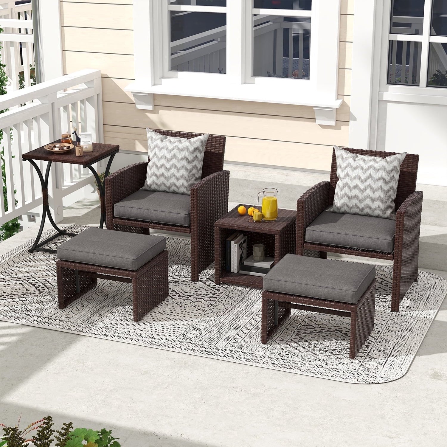 6 Piece Patio Wicker Furniture Set, Rattan Outdoor Chairs, with Cushioned Ottoman, Resin Nesting Table, Modern Design