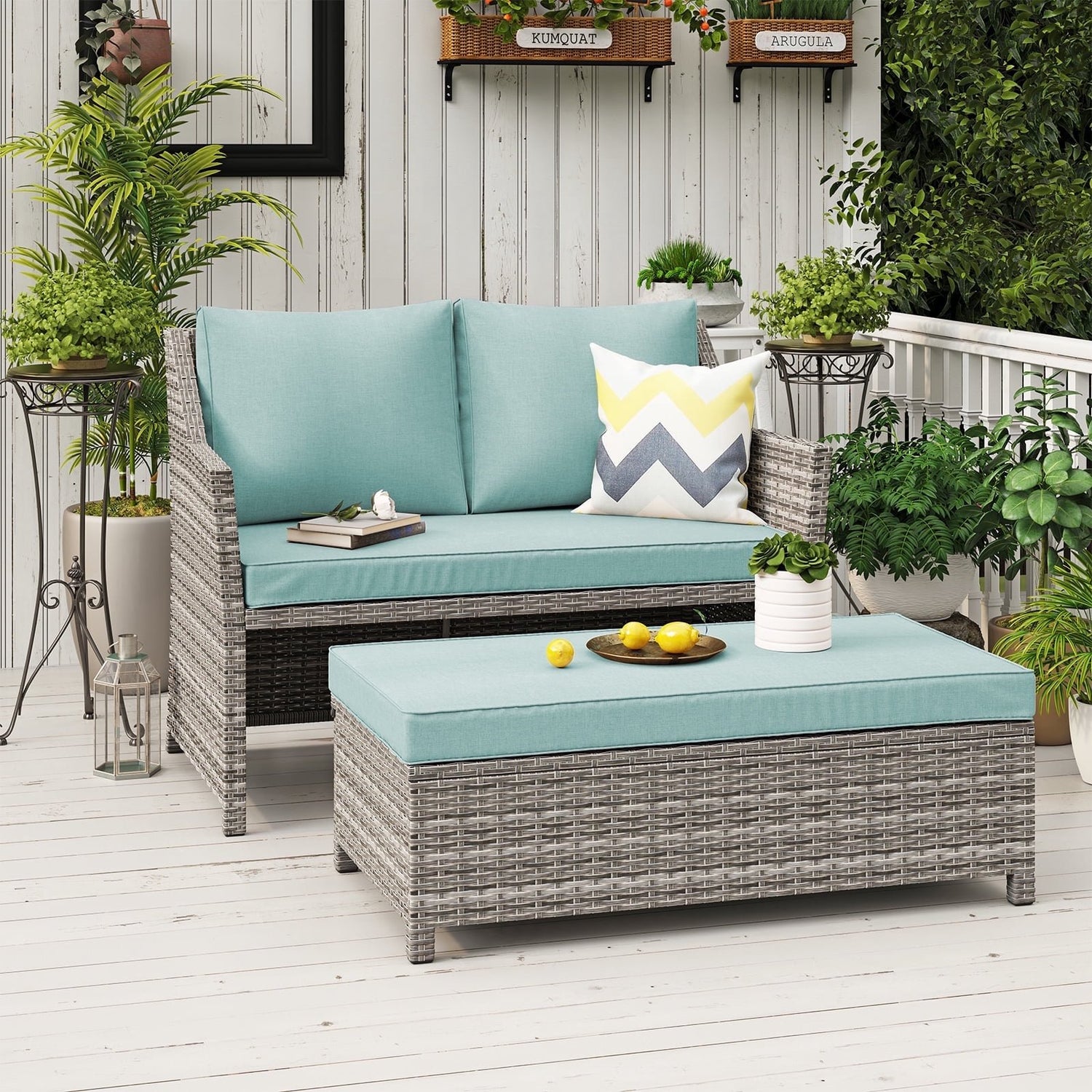 Outdoor Wicker Love Seat and Coffee Table Set, Weather Resistant Rattan, Patio Furniture with Cushions & Storage Bin - Gray is backordered and will ship as soon as it is back in stock.